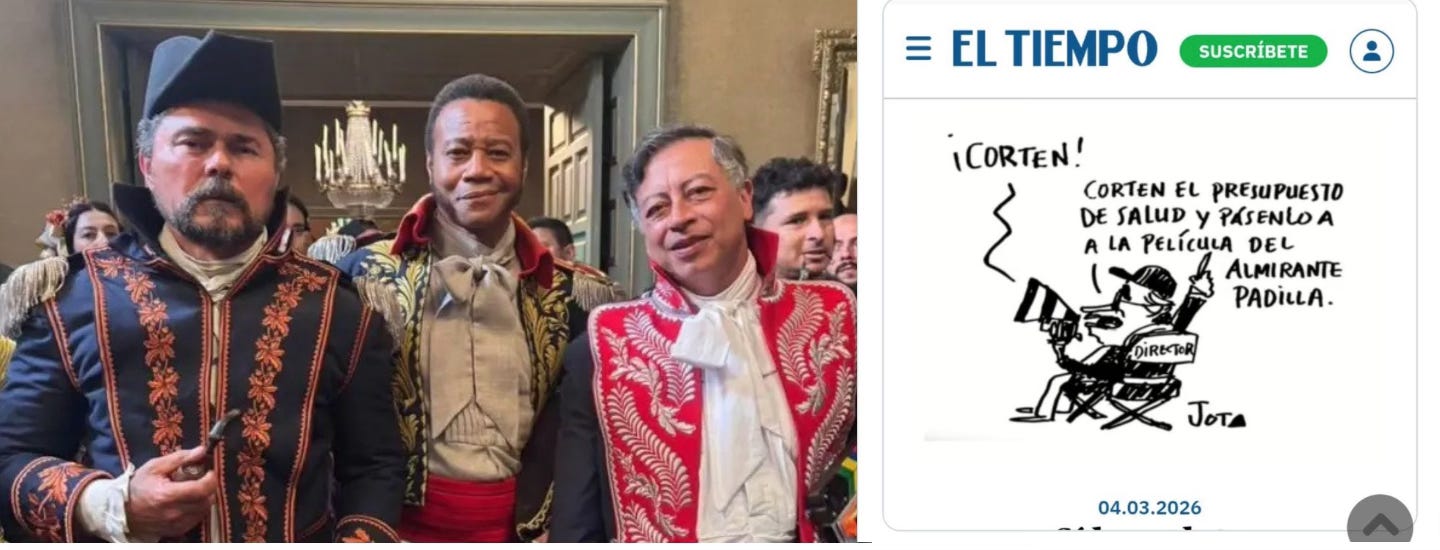 Gustavo Petro est le président (de gauche) des Colombiens pendant encore quelques mois. De manière générale, il n’est pas très aimé ici à Medellin. Dernière polémique en date le concernant : il a participé (à droite sur la photo) au tournage d’un film consacré à l’Amiral Padilla, héros de la guerre d’indépendance. Le film a été financé par des fonds publics et ça fait grincer des dents en ces temps de crise économique.