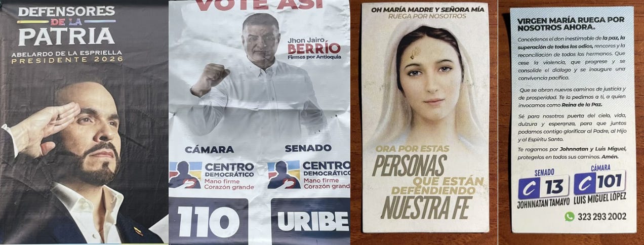 La campagne, très visible, regorgeait de signes forts : un candidat de droite montant le poing (ou l’index tendu pour tout bien nous expliquer), une candidate écolo avec un chienchien dans les bras… Et comme la religion n’est jamais très loin ici, j’ai même trouvé une publicité électorale qui incite à voter pour ceux qui prient pour vous. Bref, tous les coups sont permis, y compris organiser des fêtes juste avant l’élection ou distribuer des parapluies avec le nom du candidat. Le mot de la fin est pour Hugo Poliart : « la Colombie est en train de devenir une démocratie parlementaire à l’européenne. Tout le monde peut désormais s’exprimer. Pendant des dizaines d’années, faute de dialogue, on a eu la guerre ici. Et donc, même si on peut ne pas être d’accord avec les idées des uns ou des autres, mieux vaut mille fois la politique que la guerre ! »
