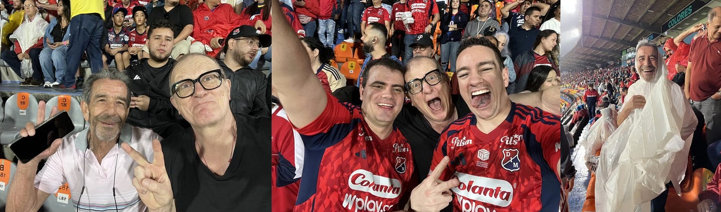 Je suis allé au foot avec Gilberto qui n’était plus allé au stade depuis un match où jouait... Pelé ! Ce qui nous ramène il y a environ 300 ans. Le match, comptant pour la Copa Libertadores, était un véritable cours accéléré d’insultes hurlées par des gars avec une vareuse aux couleurs du club qui recevait (Independiente Medellin). Liste des insultes sur demande.