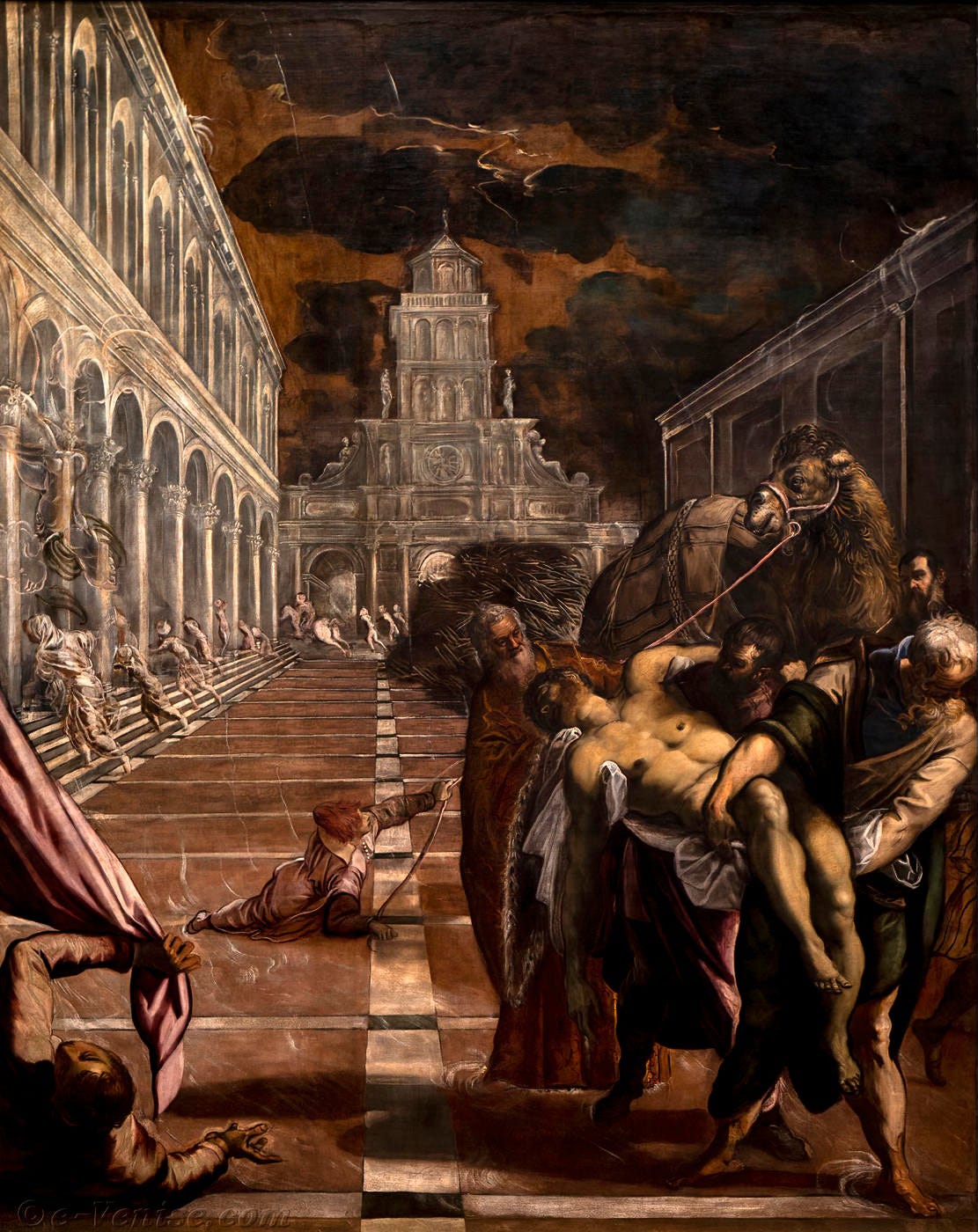 Tintoretto encore (je vous avais prévenus) : Matteo me montre L’Enlèvement du corps de Saint Marc à l’Accademia et me raconte l’histoire qui va avec : de nombreux exégètes, spécialistes de tout poil — et même Sartre — ont échafaudé des théories sans fin pour expliquer pourquoi le ciel est rouge et les nuages noirs dans ce tableau.